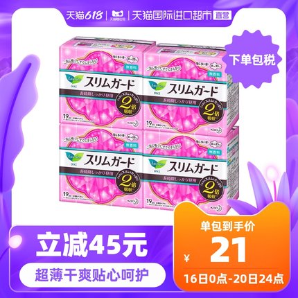 柔软舒适贴身,脆弱经期,贴心伴侣。目前天猫国际 4 盒售价¥129,下单立减 45,叠加¥5 优惠券,实付¥79 包邮包税到手 4 盒。