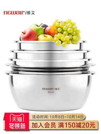 超值的不锈钢盆 5 件套,加厚加深,多用途大容量。目前天猫商城 newair 维艾麦威专卖店售价¥69,A 款 20-26cm 款(第 1 款)此价,叠加¥30 优惠券,券后实付¥39 包邮,持平以往低价,另有其他规格可选,价格略贵。