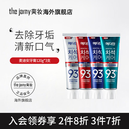韩国品牌麦迪安牙膏,温和去渍,主打美白牙齿,帮助减少牙菌斑,调节口腔酸碱平衡,护齿健龈,清新口气。目前天猫国际 thejamy 美妆海外旗舰店 120g*3 支 售价¥37.9,下单 2 件立减 21.8 元,还可使用¥5 优惠券,双重优惠实付¥49 包邮,4 款可选,折合¥8 / 支,比实体店的价格便宜多了。