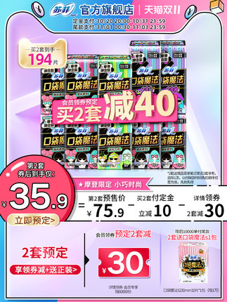 一次搞定一年的量,低至 0.57 元 / 片!口袋魔法日夜组合装,没有护垫凑数,只有普通卫生巾一半的大小,掌心尺寸,方便携带。目前天猫苏菲官方旗舰店预售价 75.9 元,支付 10 元定金立减 5 元,满 2 套立减 40 元,领取 140-30 元优惠券,拍 2 件(需定金 20 元),11 月 1 日付尾款,到手价 111.8 元包邮,到手 194 片,折 0.57 元 / 片,可凑跨店满减满 200-30(即 85 折),到手 95 元更划算。