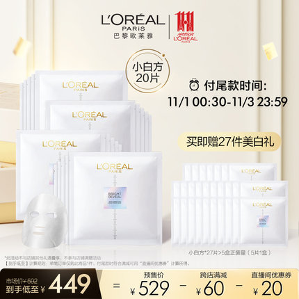 【买就送 27 片小白方面膜】欧莱雅小白方精华面膜,晶透淡斑,美白修护,补水保湿淡纹,超品预售,买 20 片送 27 片,共计 47 片超划算!