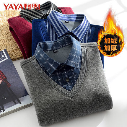 鸭鸭 男士冬季加绒加厚衬衫领假两件针织毛衣 多色 79 元包邮