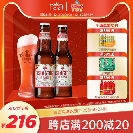 青岛啤酒官方旗舰店, 12 月 12~14 日 天猫双 12, ¥216 元 双 12 价, -25 元优惠券, -20 元 (每满 200 减 20 元) 跨店满减, =171 元 到手价,规格为 258ml*24 瓶,整箱装,是青啤为了和福佳玫瑰红抢夺市场出的一款精酿啤酒。