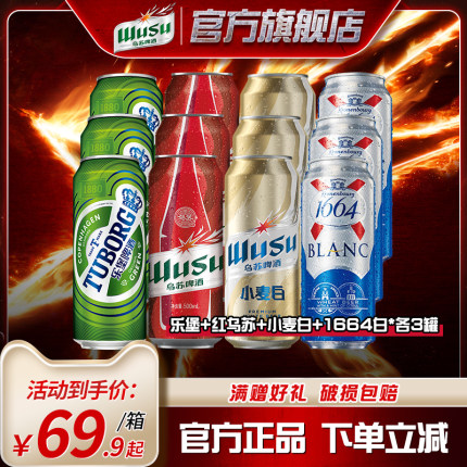 3 种口味一个组合套装, 500mL*12 罐,不同口味都尝尝。 优惠实付¥59.9 包邮,红乌苏 500mL*6 罐 + 乐堡 500mL*6 罐组合券后同价,其余套餐略贵。