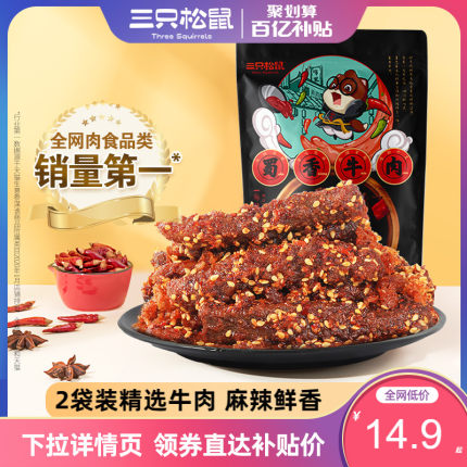 口感醇厚,色泽诱人,韧而不硬,口口耐嚼!这款麻辣牛肉干 100g*2 袋在天猫商城三只松鼠旗舰店售价¥26.9,可领取¥9 优惠券,实付¥17.9 包邮,2 种口味可选,折合约¥8.95 / 袋,入手低价,蜀香麻辣,酣畅淋漓。