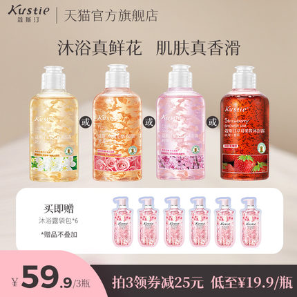 花瓣,莹滑肌肤,滋润不紧绷,留香 12 小时,洗后丝滑透亮, 实付¥39.9 包邮,折合¥13.33 / 瓶,下单即送沐浴露袋包 * 6 个。